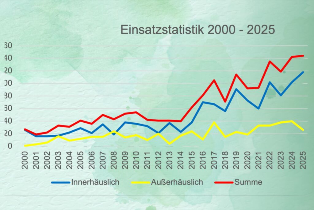 Rote Linie (Summe): Die Gesamtzahl der Einsätze hat sich in den letzten zwei Jahrzehnten deutlich erhöht – von etwa 25 Einsätzen im Jahr 2000 auf über 144 im Jahr 2025.